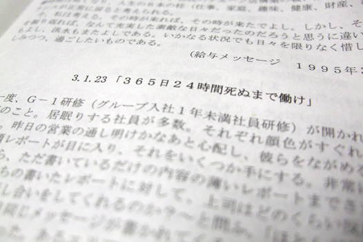 また、入社内定者に配布される人材開発部作成の『質疑応答』では、勤務時間について、『「仕事は、成し遂げるもの」と思うならば、「勤務時間そのもの」に捉われることなく仕事をします。